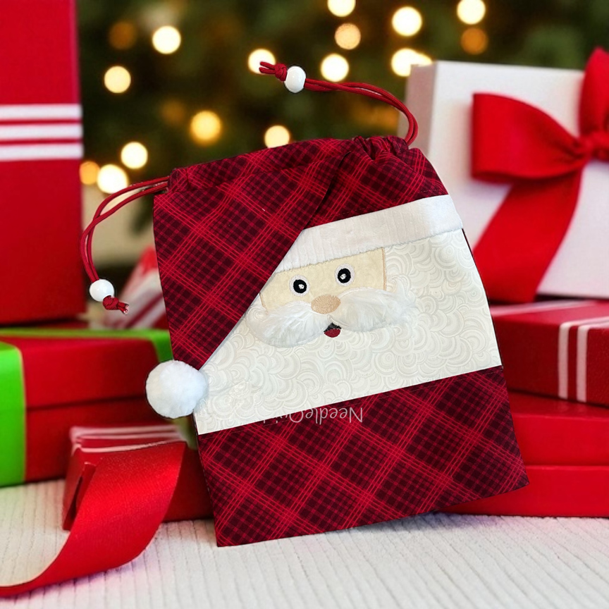 The Santa Drawstring Pajama Bag is a versatile machine embroidery and sewing project featuring a Santa with a faux fur mustache and a drawstring closure as well as a unique boxed bottom. The bag is fully lined with no exposed seams on the inside. This bag can also be used for gifts as well as pajamas. After stitching the machine embroidery design, this fun pattern is very quick and easy to assemble using your sewing machine.