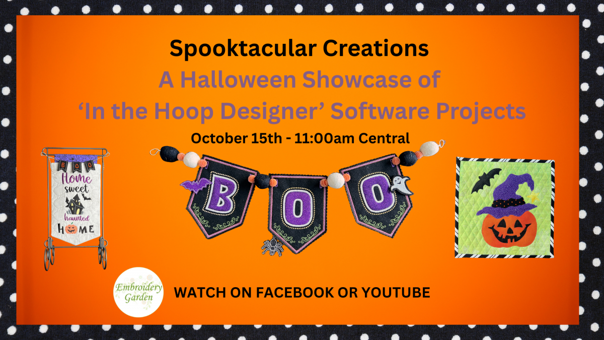Join me on October 15th at 11:00am central for a Halloween showcase of Embroidery Garden projects. It’s so much better to see my creations under the camera instead of a flat photo. I’ll be showing and answering questions about the many boo-tiful designs and projects I’ve recently created for spooky season!
