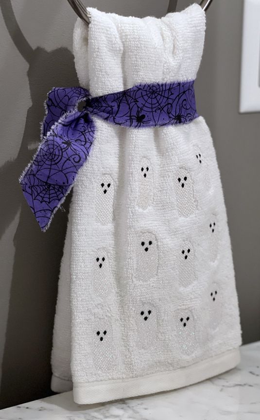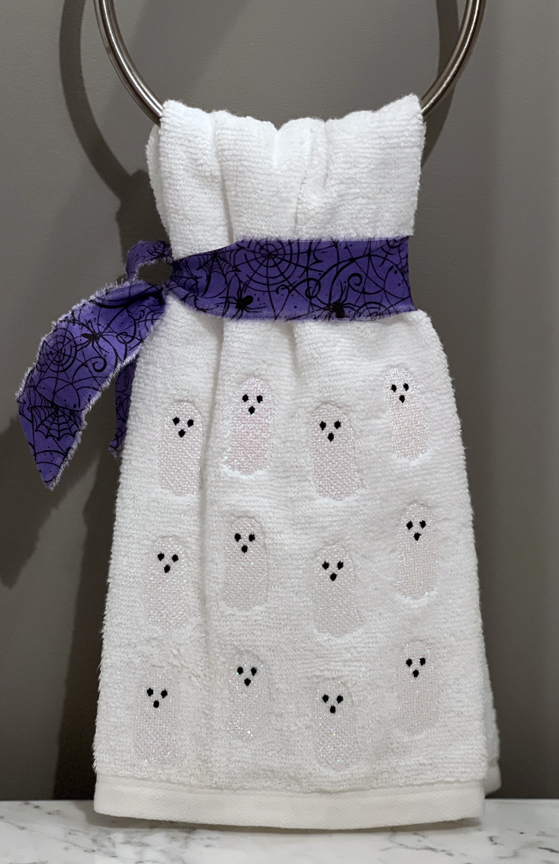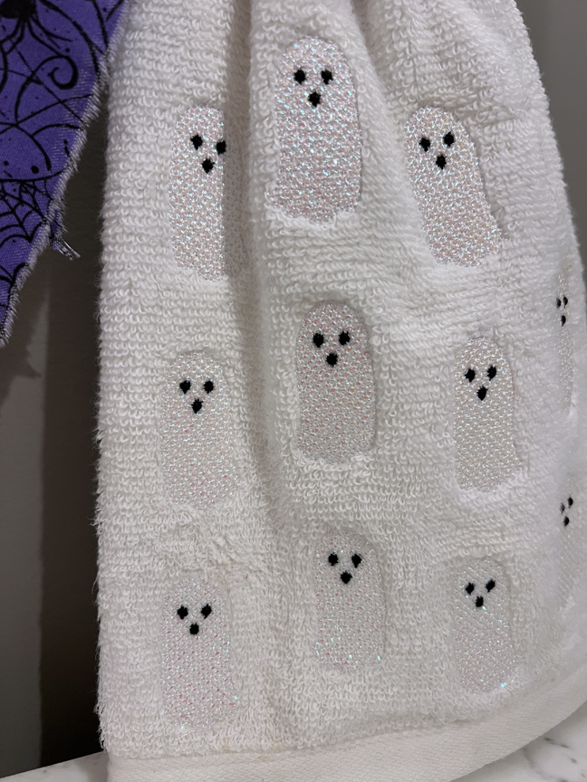 These little ghosts are designed to be stitched on a towel as a reversed embossed technique.