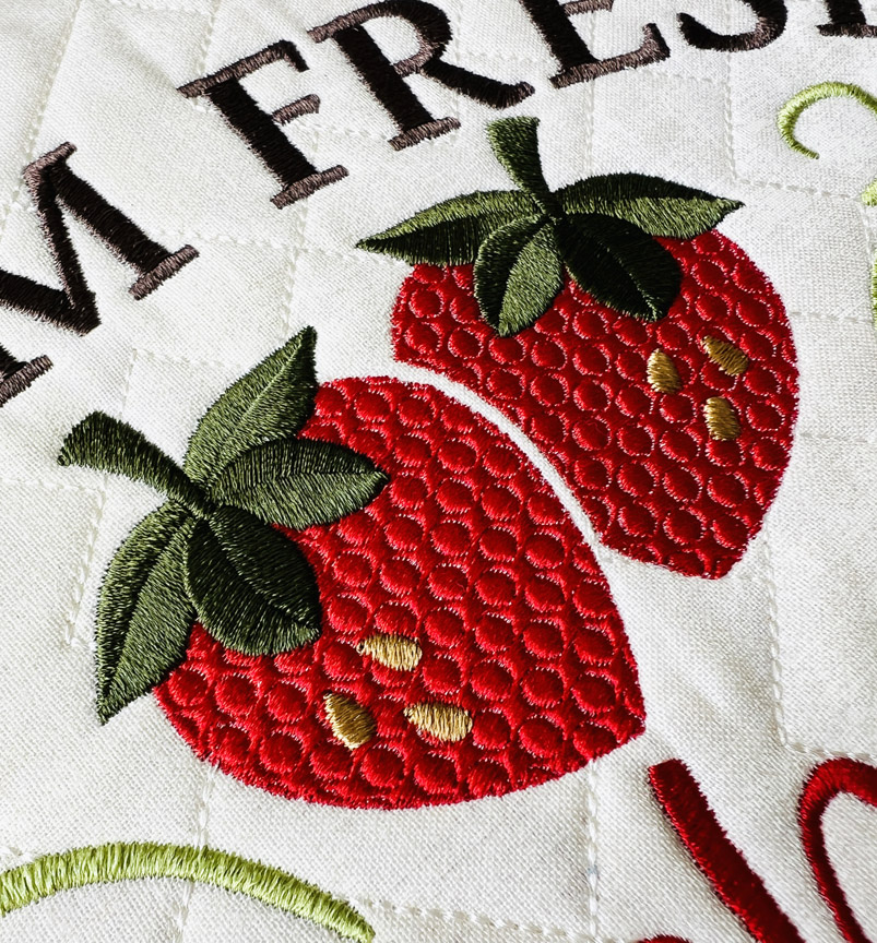 This sweet strawberry set includes an in the hoop coaster, mug rug, mat and hanging along with individual designs.