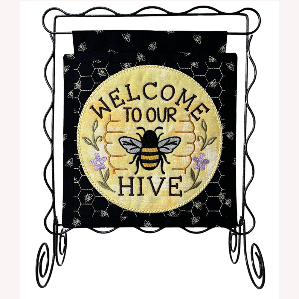 Note the black fabric used in the sample has the bees on it. The tiny bees are not embroidered. The honeycomb background is embroidered and in the file.