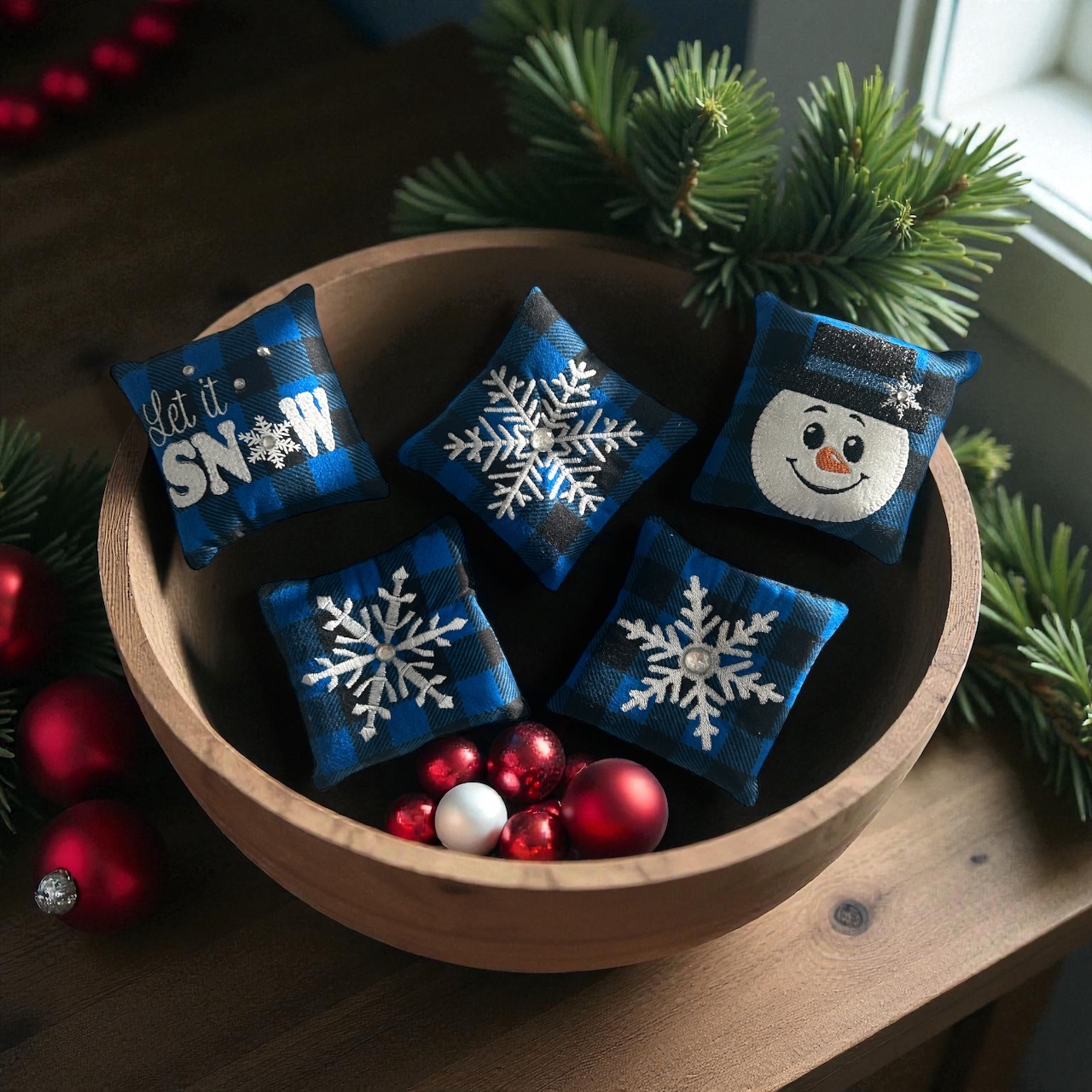These “Let it Snow” Bowl filler Mini Pillows made with seasonal fabrics and designs like the snowman face, snowflakes, and “Let it Snow” themed saying, are designed to be used as a creative addition to your seasonal decor, such as filling bowls, baskets, or tiered trays, and can compliment any style of home decor.