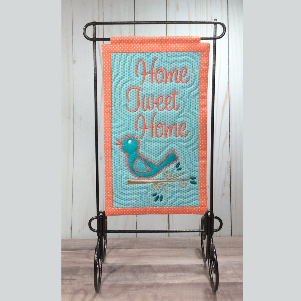 We’ve turned a few of our popular birdie appliques into a set of 4 hangings that fit most 6×10 hoops. They’re finished completely in the hoop and can be displayed on table top metal stands from Ackfeld Wire.